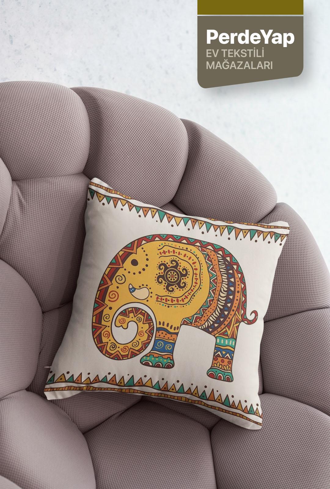 Krem Zemin Üzerine Etnik Hint İşlemeli Fil Desenli 4lü Dijital Baskılı Kırlent Yastık Kılıfı 43x43 Cm 060
