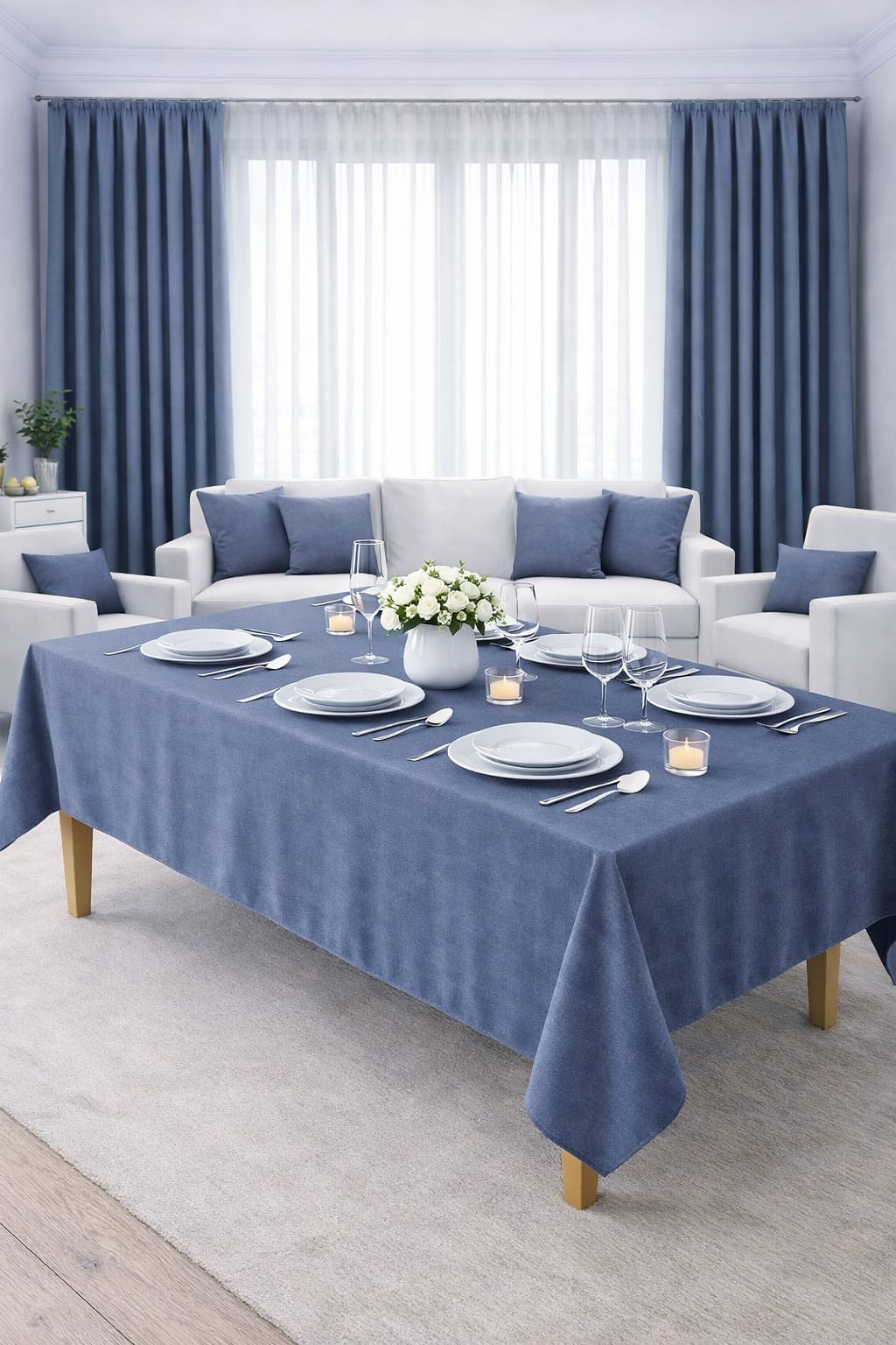 PerdeYap Kadife Dokulu Açık İndigo Renk Masa Örtüsü