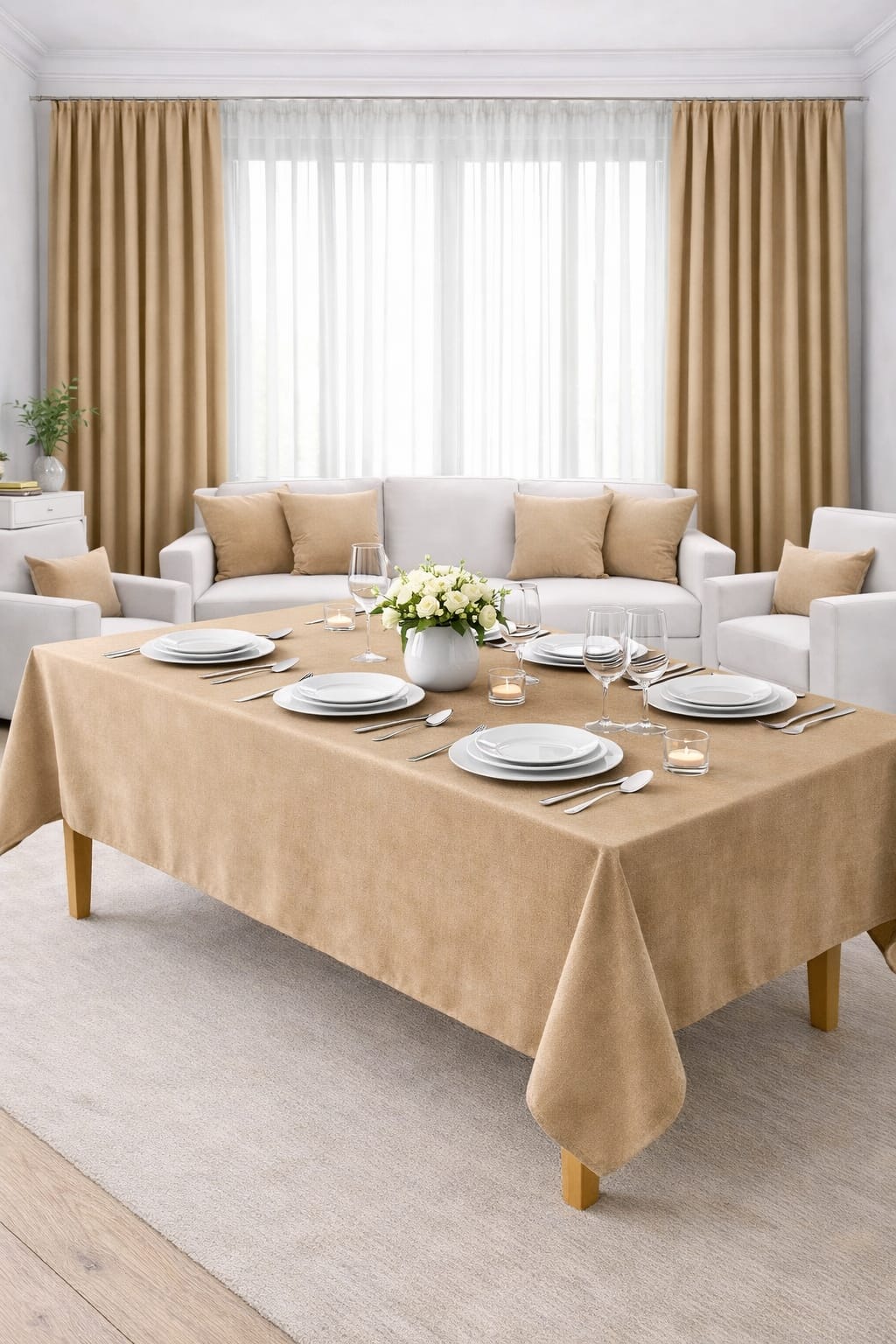 PerdeYap Kadife Dokulu Bej Renk Masa Örtüsü